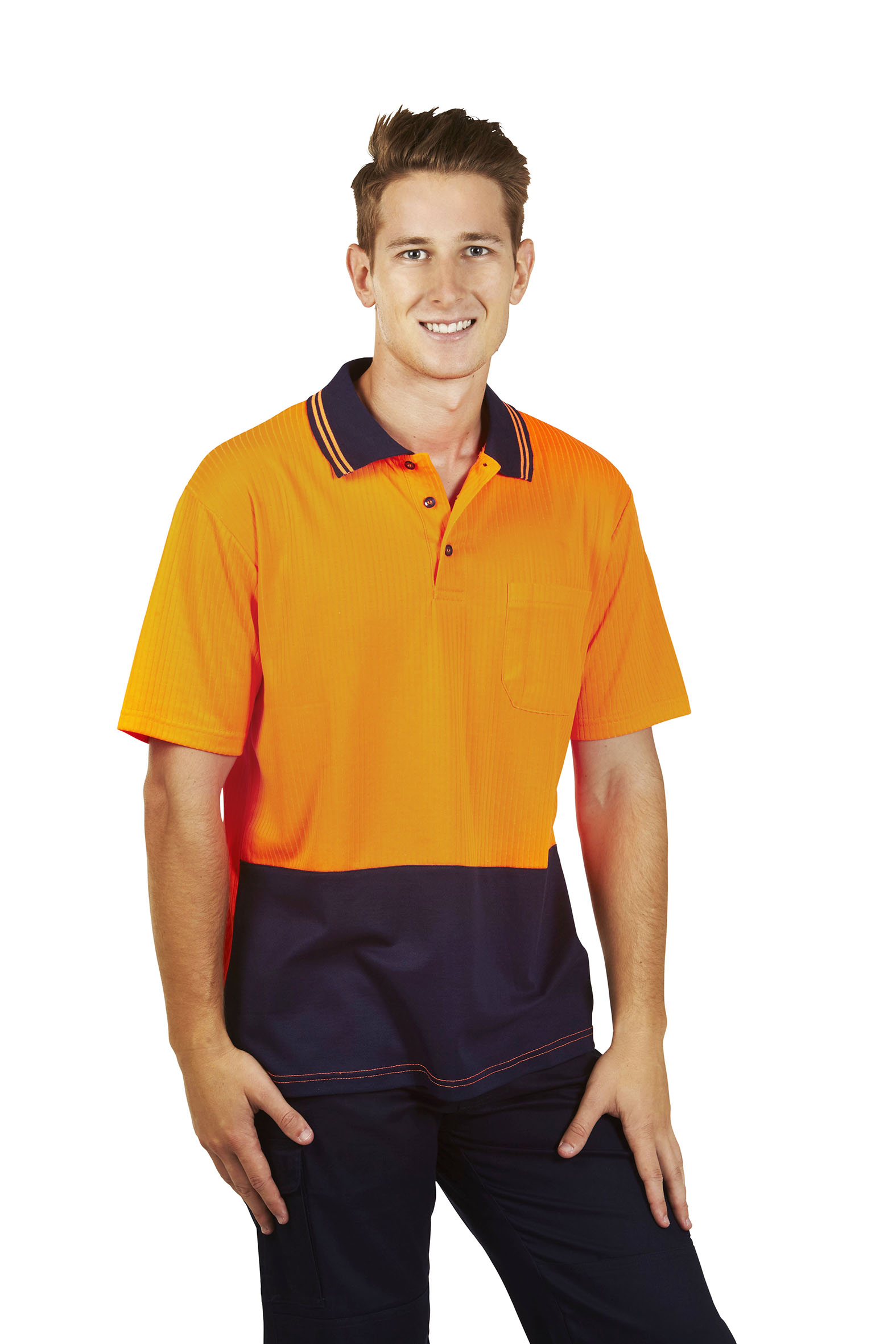 Newest hi vis fabric that complies with AS/NZS 1906.4:2010 which has polyester outer shell and cotton back lining and is knitted by traditional drop needle interlock machine, is the feature of this polo shirt. It’s light and comfortable with cotton inside. It’s extra cool and smart looking with the natural patterns created by the drop needle interlock knitting.